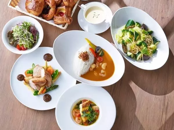 ホテルの公開広場に面した店内は、明るく落ち着いた空間。高い天井や白を基調とした内装は、まるで海外リゾートのような優雅で贅沢な雰囲気をつくっています。フランスの画家ポール・ギヤマンの絵画が展示され、鑑賞しながら食事が楽しめます。ベビーカーでの来店が可能で、ソファ席もあり小さな子ども連れでも訪れやすいので、ママ会にもぴったりです。