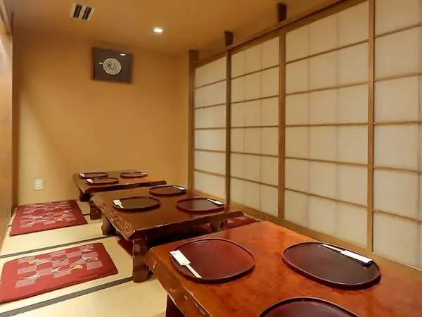 和の趣のあるエントランスから店内へ。中には掘りごたつ式の座敷席とテーブル席の両方が用意されているのがうれしいところ。座敷席は最大36名での利用も可能です。人数に応じて使える大小の個室も完備。こちらは座敷席になっていて、ゆっくりと食事を楽しむことができます。