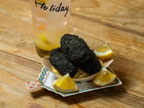 本通駅から徒歩5分の場所に店を構える【自然派ワインとお惣菜ホリデー食堂】。『黒いカキフライ』は竹炭入りの黒いパン粉で上げられていて、見た目のインパクトも十分。ほかにも地元広島県産の牡蠣やレモンを筆頭に、全国から厳選した食材を使ったアラカルトメニューが楽しめます。