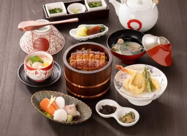 ミニひつまぶしに季節のミニ天ぷら・お刺身3種・茶わん蒸し・鰻と昆布の山椒煮・小鉢がセットになった中部国際空港店限定御膳です。