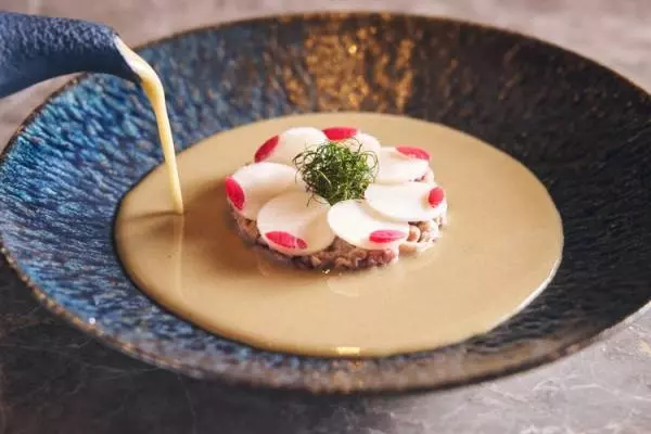 これは、EARTH氏の祖母から受け継ぐタイ南部の伝統料理をアレンジした一皿です。ガーリックオイルにマリネした自家製の塩漬けフィレ肉に、牛骨ブロス、ココナッツ、ハーブ類を3日間かけて煮込んだコク、旨み、香り豊かなスープを合わせています。トッピングは、サクサクとした食感の菊芋のスライスとエシャロット。絶妙な五味のバランスで忘れ難い一皿になること間違いないでしょう。