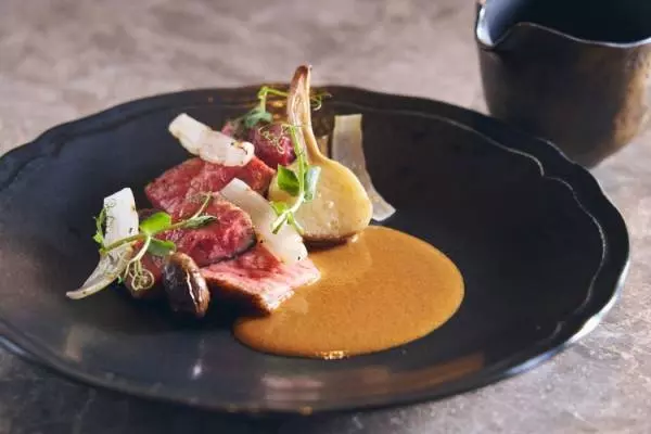 日本の食材にも興味津々のEARTH氏が【SAAWAAN BISTRO】のオープンにあたって新たに生み出したのがこの『和牛のマッサマンカレー』です。マッサマンカレーといえばタイではじゃが芋、玉ねぎ、鶏肉のカレーですが、レアに火を入れたサーロインを主役に、シナモン、八角、クローブ、カルダモン、ナツメグなどによる自家製のカレーペーストで、良質な牛肉に合うこの上なく上品なカレーソースを仕立てて合わせているのです。