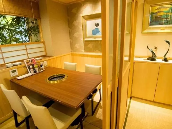 和のテイストでまとめられたエントランスから店内へ。4名用や6名用、8名用など、個室をメインとしたつくりで、さまざまな人数に対応しています。オープン席では16名での宴会もOK。畳座敷にもテーブル席が用意されているのもうれしいところ。有名画家の絵画が掛けられた落ち着いた空間で、食事を楽しめます。