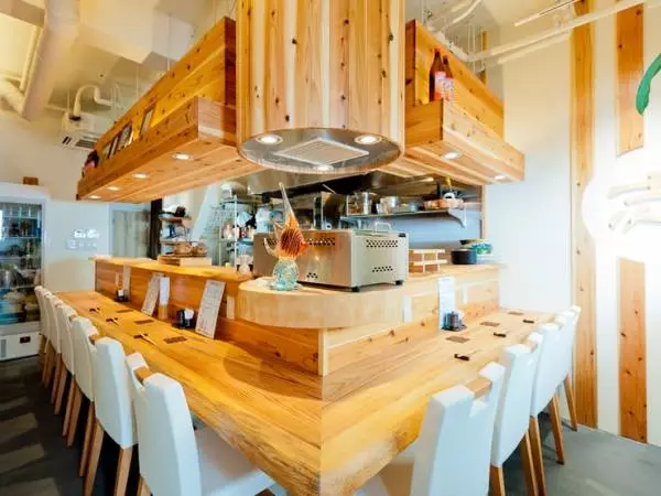 入り口は、年代を問わず利用しやすいようにと、床の段差をなくし、軽く開閉できる上吊りの引き戸を採用してバリアフリーを実現。店内は10名ほどが座ることのできるカウンター席のみ。一枚板から切り出された厚みのあるカウンターで、じっくりとおいしいおでんを楽しむことができます。