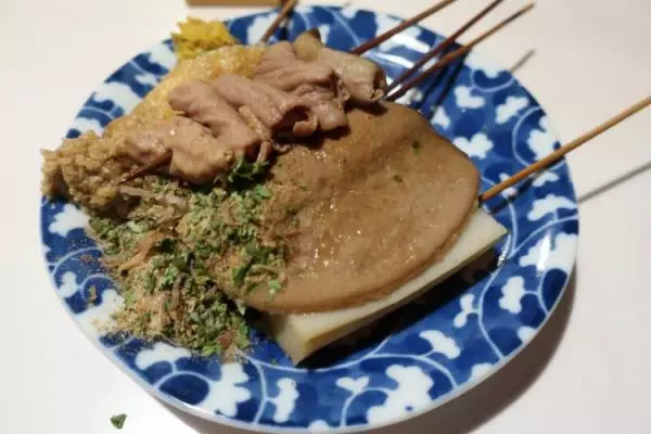 モツや練り物など、見慣れないおでん種を楽しむのが「静岡おでん」。ダシ粉をかけて食べる