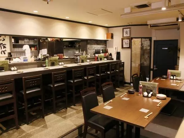 お店は駅近に立地しながらも、繁華街からは少し外れているため、隠れ家的な雰囲気も。店内は間接照明の優しい灯りが印象的。カウンター席とテーブル席が用意されていますが、テーブル席は暖簾を下げると半個室的な使い方もできるなど、そのときどきの気分に合わせて、いろいろなシーンで利用可能です。
