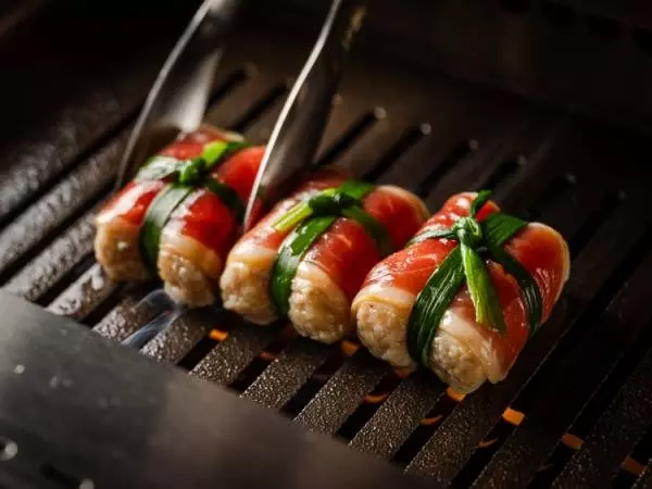 味変もさることながら、誰しも目を見張るのが、ご覧の『縛りつくね』。つくねを鴨の生ハムで巻き、ネギで縛ったもので、「【焼肉うし松】の人気メニュー『縛りタン』のアレンジです。間接的に火が入るので、つくねがふわっとジューシーに仕上がるんですよ。」とは佐藤総料理長。つくねの中身は腿肉や軟骨、そこにレンコンも加えて食感を与えている。なるほど、これを上手に焼くのは素人ではなかなか難しい。鶏の場合、他の部位も一般的な牛焼肉に比べるとやや厚みがあり、ハードルはけっこう高そうだ。スタッフが焼くというのも道理だろう。
