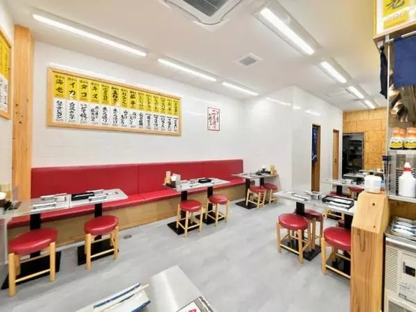 ジャンジャン横丁の中にあるお店は、大きく店名の書かれた看板と暖簾が目印。店内はオープンキッチンになっていて、カウンター席からはスタッフの動きを見ることもできます。テーブル席の壁にはメニューをずらりと掲示。昭和の食堂のようなレトロな雰囲気がたまりません。