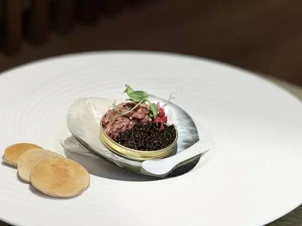 プチプチ食感と、控えめなねっとり感がプレミア感を増してくれる、『フレッシュキャビアと牛肉タルタル』。個性の強い食材のマリアージュを、焼きたての蕎麦粉入り自家製パンケーキにのせて愉しみます