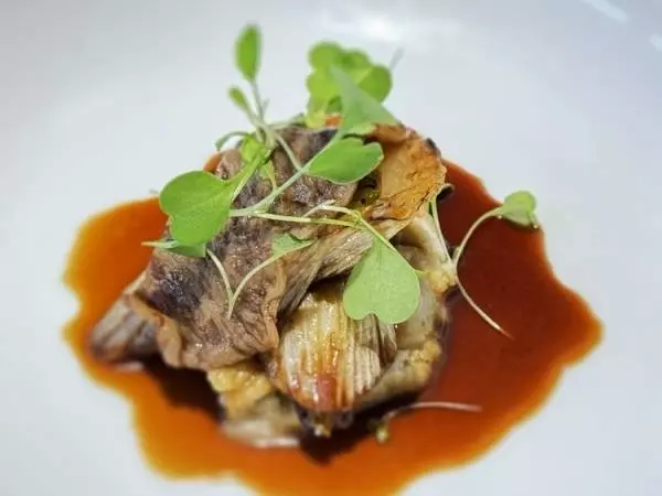 和牛本来の旨みを最大限引き立てる味わいを追求した、という一品。ソースにはシェリー酒と津軽りんご100%を使用するなど、日本食の代名詞である「SUKIYAKI」にフレンチのエッセンスを取り入れたメニューとなっています