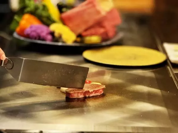 カウンター席目の前の鉄板で、ベストな状態に焼き上げてもらう厳選銘柄黒毛和牛の『シャトーブリアンステーキ』