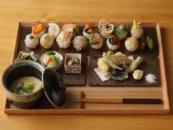 ぜひ味わいたいのは、旬の食材を一口サイズで味わえる見た目も愛らしい手毬鮨と、天ぷら、おばんざい、茶碗蒸しなどがついた『月替わりセット』。また、お茶本来のおいしさを味わえるように一杯ずつ丁寧に淹れられた日本茶がいただけるのも魅力の一つ。心癒される至福のひとときを提供するお店です。