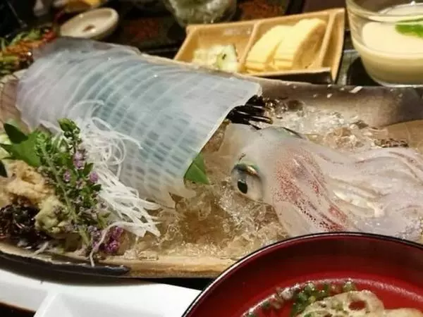 ランチタイムに提供している『活烏賊定食』。天然の活イカは、福井市ではめったに食べられないためとっても希少。ミミとゲソは天ぷらで堪能できます。