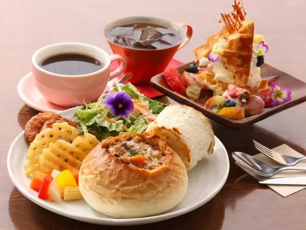 かわいい!と歓声が上がりそうな、『自家製ベーグルポッドチャウダーとワッフルデザートのランチセット』は、4種類のスープから好みの味が選べます。小腹がすいたときのオススメは、『となみ野ブルーベリーワッフルサンデー&ドリンクセット』。ほかにもパフェやワッフルサンデー、手づくりにこだわったおいしいスイーツなど、メニュー選びに迷うこと必然です。