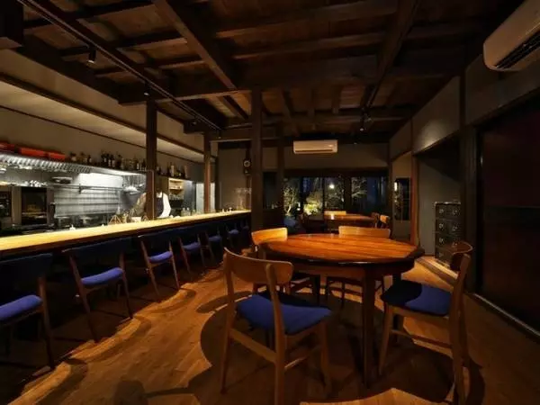 レトロな看板と林檎の木がデザインされたディスプレイが目印の、上品な風情漂う外観。店内は木のぬくもりを活かしたシンプルでオシャレな空間で、オープンキッチンのカウンター席とテーブル席のほかに完全個室も備えています。シェフ自ら探し求めた昭和の洋食器や古伊万里の皿も懐かしい空間に馴染み、食の楽しみを深めてくれます。