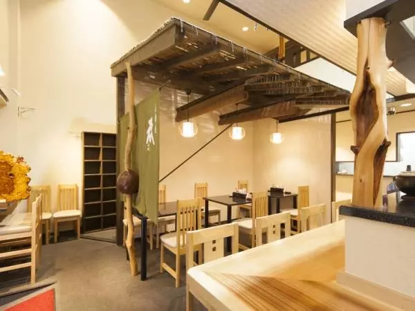 白い壁と大きな提灯が目印のお店は、エントランスからシンプルにまとめられた和の雰囲気。1階は木のぬくもりが感じられる空間で、カウンター席やテーブル席などが用意されています。2階は最大16名まで利用可能な貸し切りもOKのフロア。こちらも落ち着いた雰囲気の中で、ゆっくり食事が楽しめます。