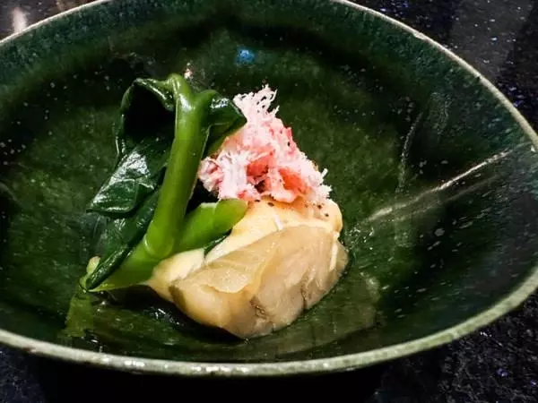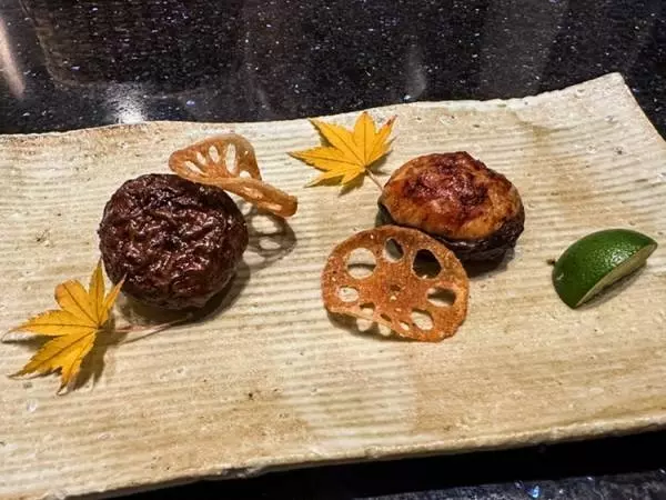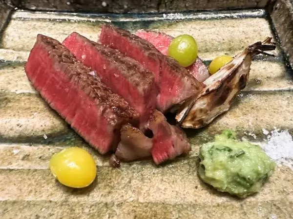 メインは「静岡そだち」という黒毛和牛のシャトーブリアンで、塩麹入りわさびと塩でいただきます。肉質は柔らかく食べやすいもので、刺身感覚でいけるものです。地元のぎんなんや蕪が添えられています。
