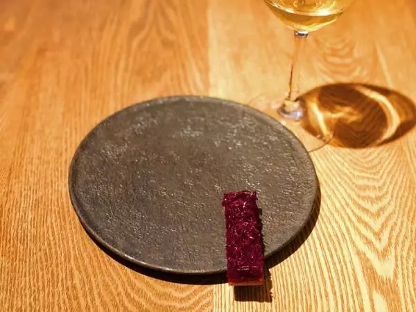 夜のコースでおなじみの、手で持って食べる【sio】のスペシャリテ。サクサクな食感の生地の上に、やわらかでやさしい甘味のある馬肉がのっています。