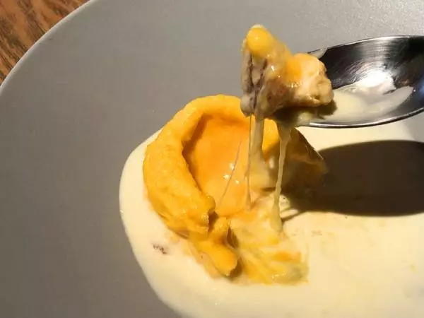 トロトロのオムレツを割ると、中に入った2種類のチーズが出てきます! 余ったポタージュはフォカッチャをつけながらどうぞ。