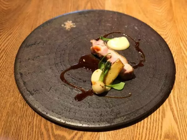 お次は焼魚をイメージしたという鰆のポワレ。皮の焼き目が香ばしく、ゆずのピューレとカブがさわやかに香ります。その味はまるで焼き魚のようでもあり、ソースを絡めるとちゃんとフレンチでもあります!