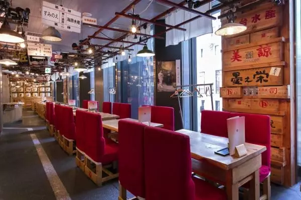 酒樽がズラリと並んだ壁、海産物を入れるトロ箱を使ったようなテーブルやイスなど、内装の一つ一つにもこだわりが光ります。大きな窓に面する席には、イスの赤が映えるオシャレなテーブル席も配置。開放感と清潔感に満ちた空間なので、カジュアルデートや女子会などにもよく似合います。