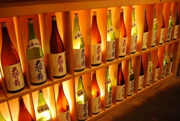 店内の壁に美しく並べられた、各種銘酒の一升瓶もオシャレ