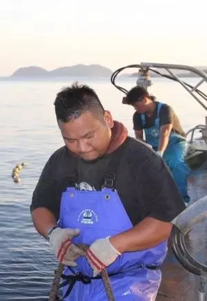 伊藤将宏さん(通称まあ君)は、唐津・串浦の腕利き定置網漁師。漁師の家に生まれ、定置網漁を継いで操業する生粋のフィッシャーマン。奥は 一本釣り漁師の小田悠介さん。料理人をする中で漁業の魅力に目覚め、串浦へ移り住んだという異色の一本釣り漁師。