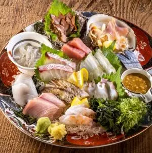 さまざまな鮮魚や季節の貝類を味わえる看板メニュー。みずみずしい鮮度そのままでいただく「生」はもちろん、炙りや酢〆、湯霜など、その魚に合った食べ方で提供。醤油だけでなく、特製酢味噌や多彩な薬味を添えて、自分好みの味で。