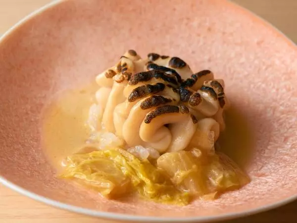 コースには、季節ごとの創作料理が6、7品登場します。寒い時季には炙った白子とクリームソースを組み合わせた一品も。白子のとろける食感とクリーミーなソースの旨みが重なり、至福の気分に。
