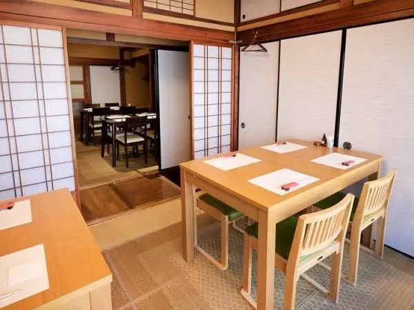 古民家風の建物にモダンなテイストをプラスしたエントランスが印象的。店内に入っても、和のテイストを活かした空間が広がっています。1Fはカウンター席や小上がり席を完備。2Fには個室が2部屋用意されていて、食事会などにぴったりなつくりになっています。