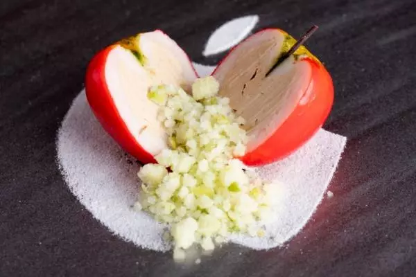 リンゴのブランデーでマリネしたフォアグラを白餡で包んだ『Apple』