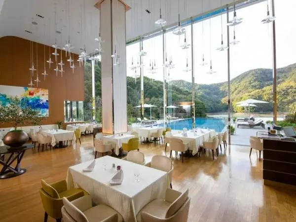 天井が高く、開放的な店内。壁一面が全面ガラス張りのメインフロアでは、目の前に広がる美しい景色を眺めながら食事が楽しめます。ホテル内にあるので、ここで宿泊しながらゆったり過ごすもよし、旅の途中に立ち寄ってランチやディナーを味わうもよしのオシャレなレストラン。ぜひ、旅行プランに加えてみては。
