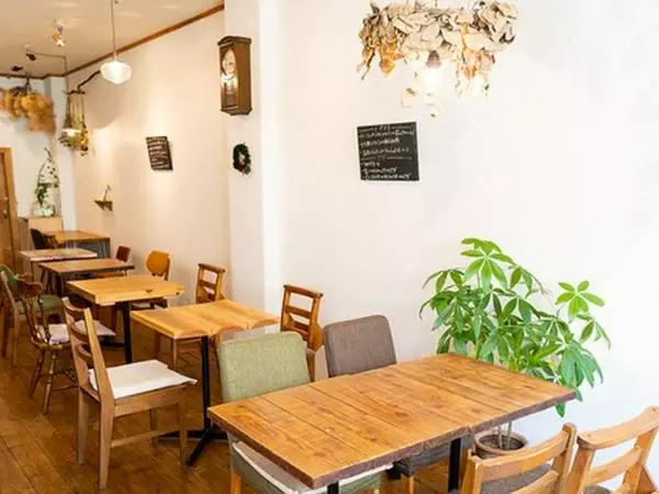 店内は、明るく落ち着いた空間が広がっています。テーブル席のほか、窓に向かって設置したカウンター席には、かわいいグリーンがたくさん飾られ、デートにぴったりな雰囲気。また店内では生活雑貨、古道具などの暮らしの道具たちも販売されているので、食事と一緒に楽しめるのもポイントです。