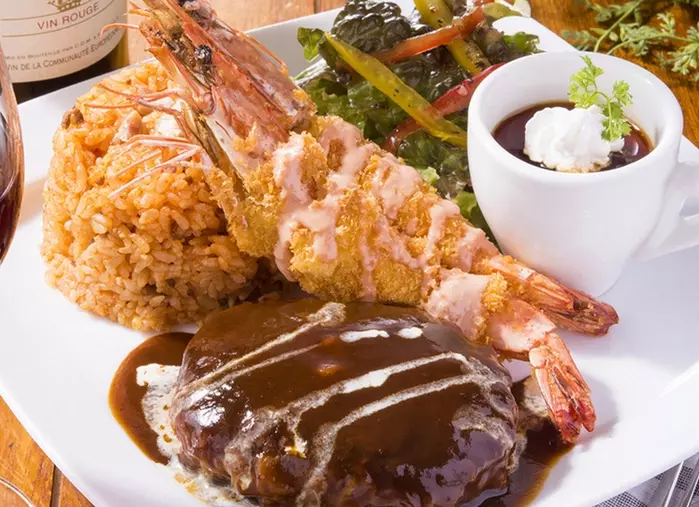 大宮シェフの代名詞ともいえるドミグラスソースは野菜の甘みと肉の旨み、昔ながらのホロ苦さがベース。シェフがこだわり抜いたドミグラスソースを使用した『ハンバーグステーキ』や『ハッシュドビーフ』はぜひ試してみたい銘皿。また、洋食の代表格のハンバーグと、名古屋名物の海老フライがセットになった『大人のお子様ランチ』も人気です。