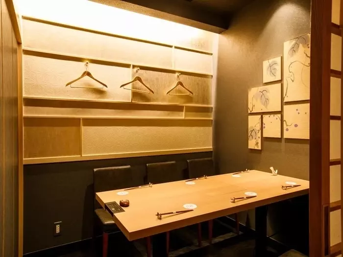 明るいブラウンを基調にした店内は、巧みなライティングや、聞き心地のいいジャズが華やぎを添えます。カウンター席と最多20人までの個室を完備しているので、人数を問わずゆっくり逸品を味わえる大人の店です。