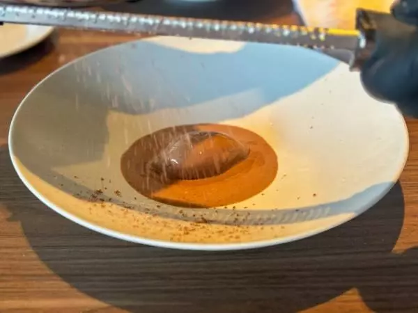 今回のデザートはアマゾンカカオを使用したドルチェで、スープ、ジェラート、最後にはアマゾンカカオをそのまま削りかけるパフォーマンスで仕上げ。華やかな香りが最後まで印象に残ります