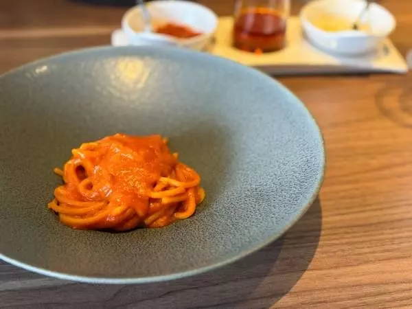にんにくの食欲をそそるいい香りと共に、スペシャリテの登場です。麺は自家製の手打ち麺で、もう1種類と合わせて使い分けているそう。太めでありながらソースとしっかり絡み、ぷりっと歯切れのいい食感も病みつきです。奥には味変でイタリア・カラブリア産唐辛子のソース、オイル、パルミジャーノが用意され、酸味や辛味で自分好みに味わうことができます