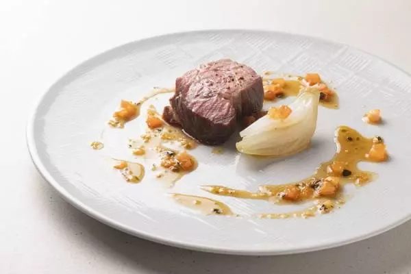 3品目は、北海道・十勝から仕入れている銘柄豚「蝦夷(えぞ)豚」。赤身メインの珍しい豚肉は、牛脂と豚脂で1ヶ月ほどコーティングして熟成をかけることで、しっかりとした旨みを蓄えています。