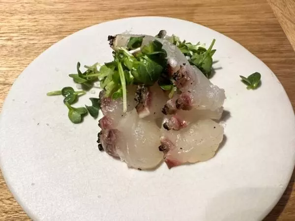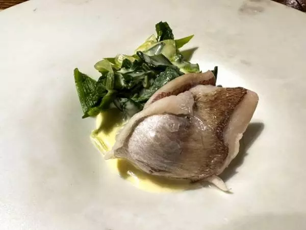 次は春を告げる山菜と魚です。甘くぬめりのあるカンゾウに、春小鯛。爽やかな一皿です。ピュイイフュメが出てきました。