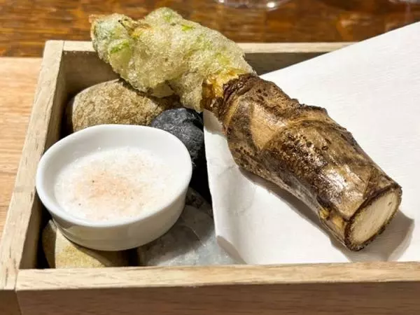 まずは、マリー・デュメのシャンパーニュの泡で喉を潤しましょう。そして桜の季節を感じるタラの芽のフライ。ほろ苦く、ほこほこした温かい感じをシンプルに塩でいただきます。
