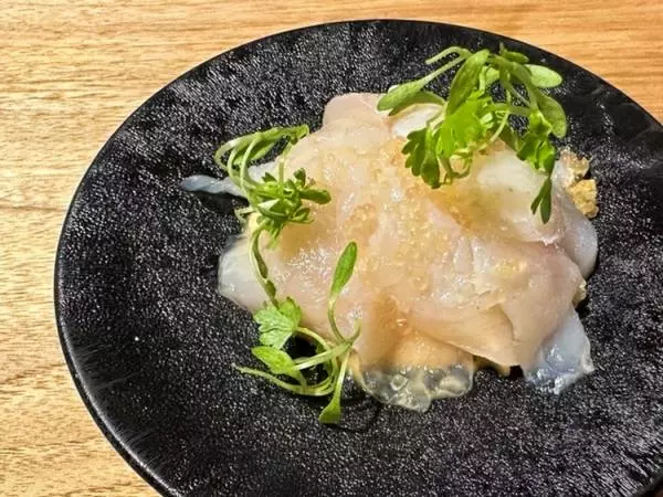フグがチーズとともに出されます。近くの牧場のチーズと甲州を使った、いわきワイナリーの白が合わされます。おもしろい食感と風味。