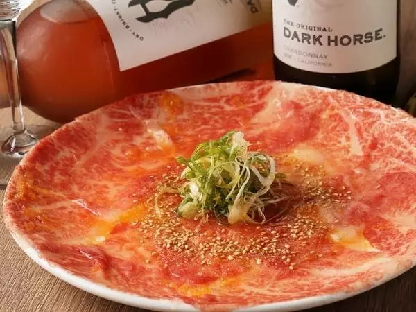 国際センター駅から徒歩2分と好アクセスの【特選和牛と産直野菜牛炙名駅店】。段戸牛や鳳来牛などの最高品質の和牛を職人が丁寧に処理し、新鮮なまま提供します。中でも注文したいのが、極上の生サーロインをユッケに仕上げた『段戸牛のサーロインレアロゼ』。柔らかな脂の甘味と赤身肉の旨みを堪能できる新感覚のユッケです。
