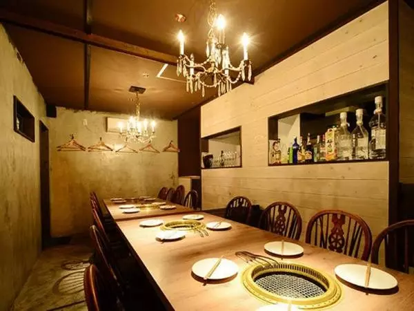 焼肉店とは思えないようなオシャレな外観の店内は、暖かでクラシカルな雰囲気。まるでバーのようなカウンター席やシャンデリアが豪華な特別感のある個室も用意されています。焼き台にはそれぞれダクトが付いているので煙の心配がないのもうれしいポイント。落ち着いた大人の雰囲気の中、ワンランク上の焼肉を楽しんでみませんか。