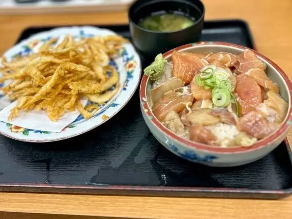 『魚屋のまかないづけ丼』700円、『みそ汁』100円、『白エビのからあげ』800円