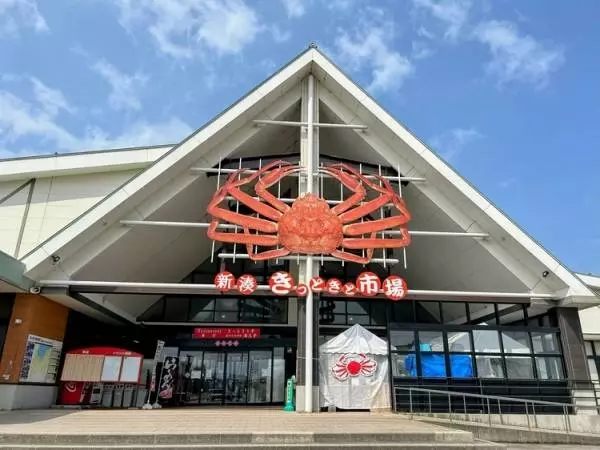 大きな蟹が目印。新湊漁港の獲れたて食材が楽しめる「新湊きっときと市場」