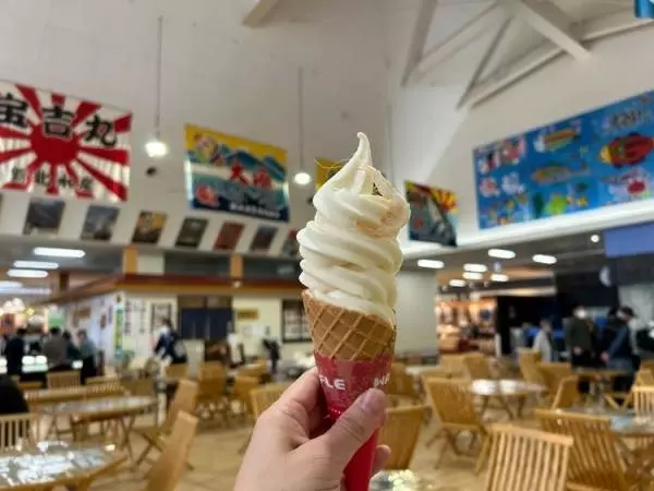 なんと、シロエビがちょこんと1匹のった『白えびソフト』なるものがあるじゃないですか!ソフトクリームにもシロエビが練りこまれているそうで、味はほんのり甘じょっぱく、シロエビの風味がしっかりと感じられました。気になる方はぜひ!