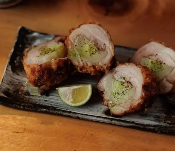 本店でも定番のから揚げが、進化したオススメメニュー。ありそうでなかった、ねぎまをイメージしたから揚げです。香りと食感のいい肉厚の国産ねぎを鶏肉で包んで揚げた、サクッとジューシーな風味にお酒がすすみそうです。
