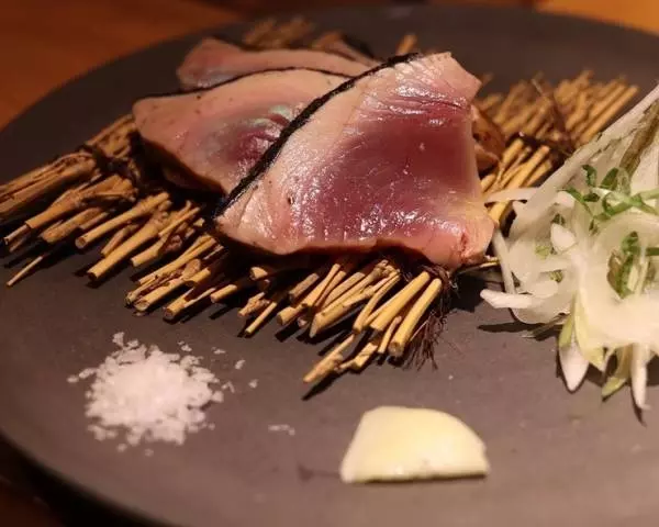 旬を迎えた鰹が入ったときは、藁で香ばしく燻したたきで提供。まずは塩で味わって、さらに九州の甘めのミツル醤油とニンニクでどうぞ。日本酒はもちろん、焼酎ともぴったりの相性です。