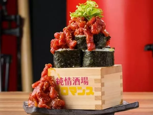 東梅田駅から徒歩1分の場所に店を構える【純情酒場ロマンス】。とろとろチーズがたまらない『肉巻ロングチーズキンパ』や、名前とおりユッケが崩れ落ちた様子でサーブされる『雪崩れユッケ肉寿司』など、おいしく、見た目にも楽しいメニューが豊富に取りそろえられています。