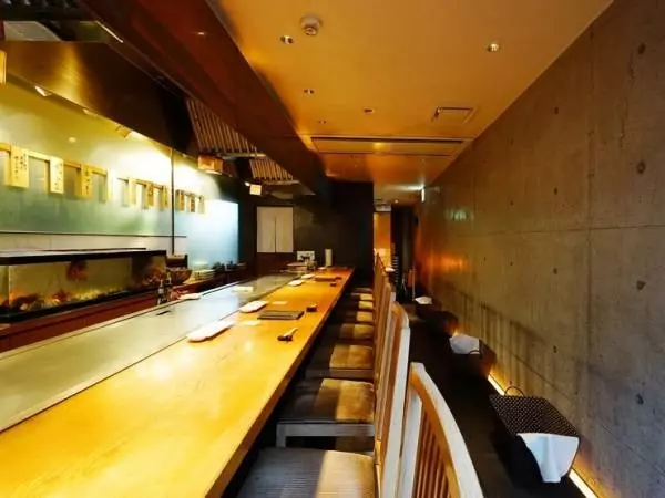 シンプルなエントランスから店内へ足を踏み入れると、アートな陶器がお出迎え。細い通路の先には、シェフのステージともいえる、ピカピカに磨かれた鉄板が待ち受けるカウンター席が。店内には個室も用意されているので、特別な日の食事会などにもぴったりです。